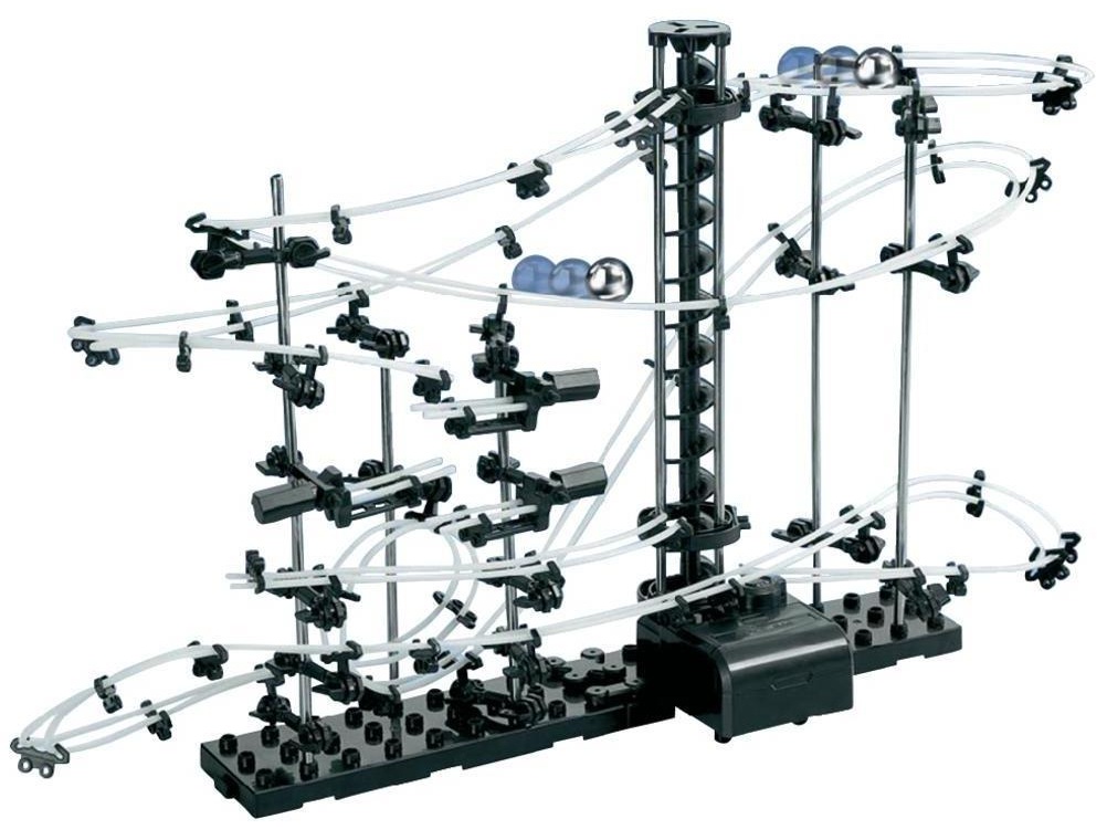 Intreaga structura este realizata din metal, plastic si fir de pescuit. Combinatia tuturor elementelor da in cele din urma o pista grozava pe care se plimba bile de metal. Aluneca pe bucle una dupa alta pana ajung la liftul care ii duce in varful cladirii, unde distractia incepe din nou. Spacerail este un puzzle 3d care va va starni creativitatea, deoarece puteti construi structuri dupa cum doriti, nu urmand neaparat pasii din manual.