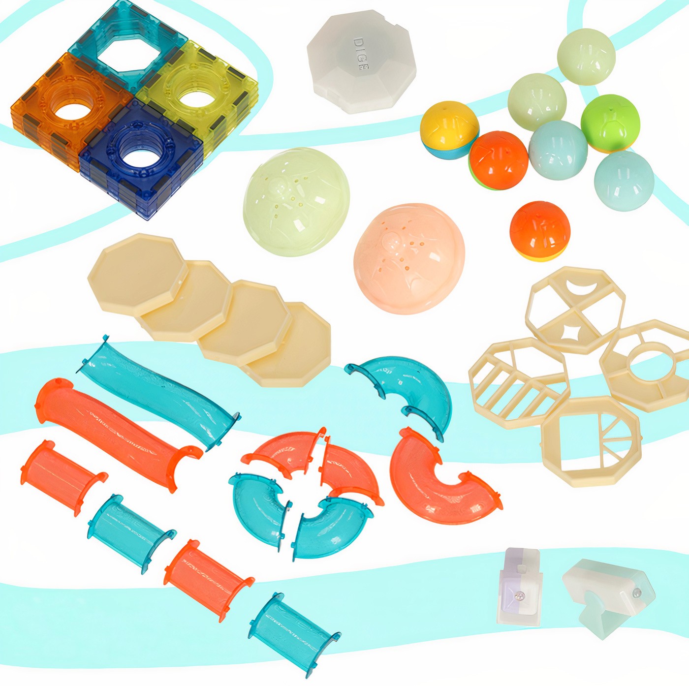 Set de constructie IdealStore, Blocuri magnetice luminoase, Pista cu bile stralucitoare, Dimensiune pachet 27 X 13 X 7.5 cm, Contine 49elemente, 4bile,20autocolante,16blocuri patrate, Dezvolta perfect motricitatea si precizia degetelor, Multicolor