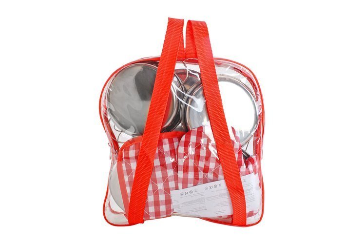 SETUL INCLUDE 13 elemente, care este tot ce este necesar pentru un mic bucatar : 2 oale, o tigaie, o strecuratoare, un capac (se potriveste fiecarei oale), un set de diferite tipuri de linguri, un rucsac si un set manusa si suport termic vase fierbinti.