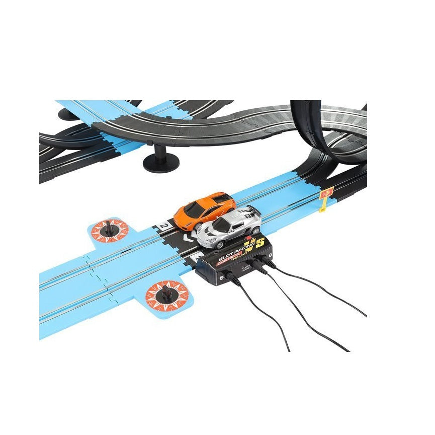 Set de joaca idealSTORE FAST AND FURIOS Include 2 masini, semne de avertizare, balustrade, autocolante, 2 telecomenzi, alimentare electrica, elemente de urmarire, Lungimea pistei 790 cm, Dezvolta abilitatile manuale si imaginatia