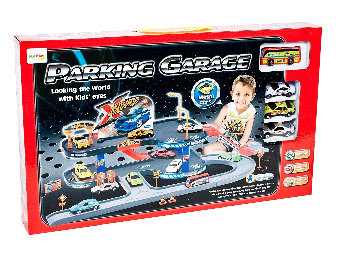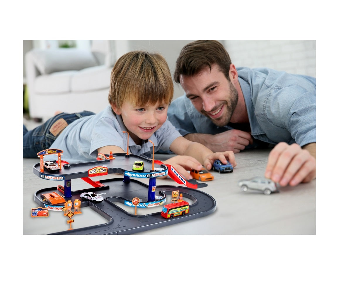 O parcare cu mai multe etaje, cu 4 masini in set, este foarte distractiva timp de multe ore. Parcare pana la 63 de centimetri latime, in aranjamentul sau initial. Toate elementele se potrivesc, motiv pentru care pot exista infinit de multe combinatii de constructii.