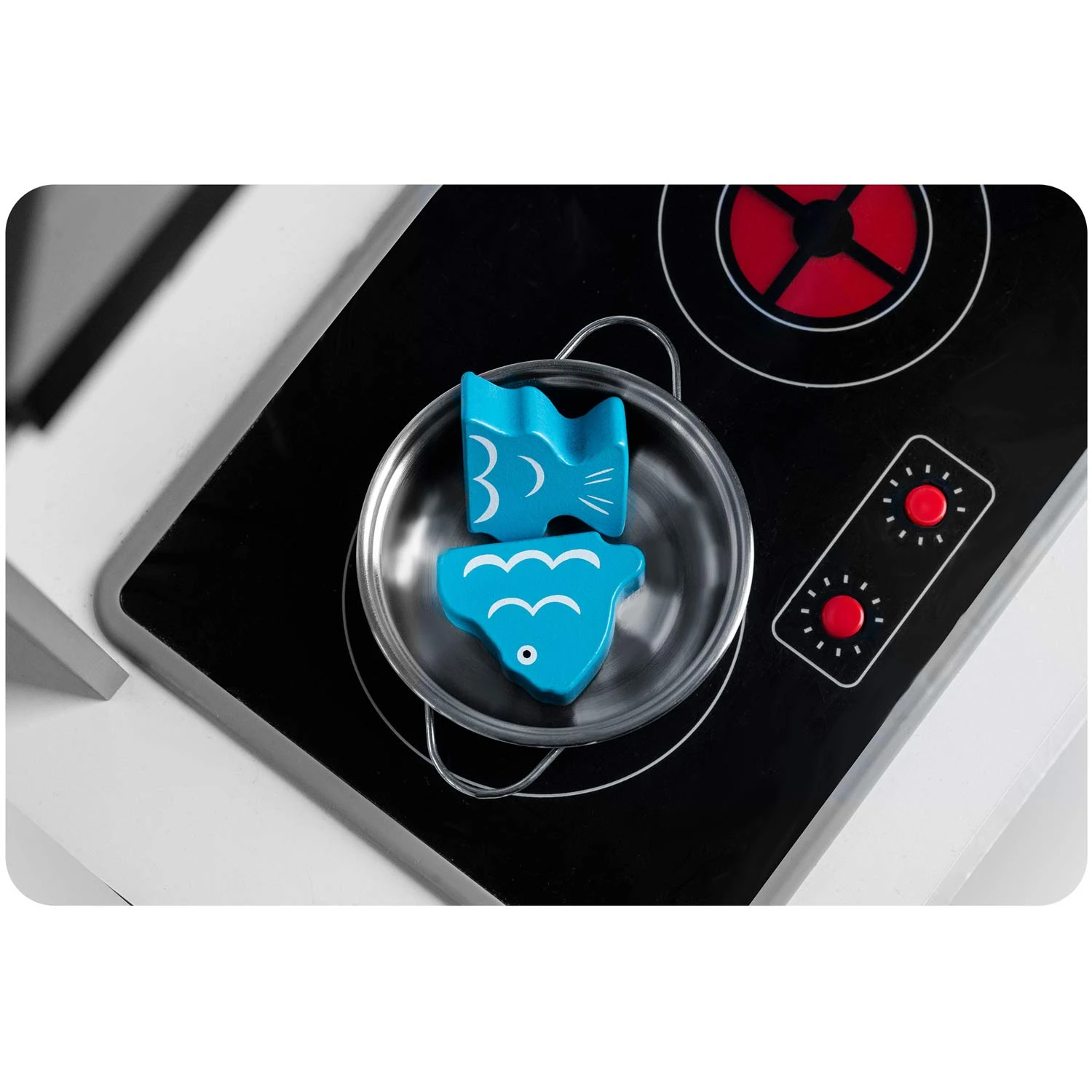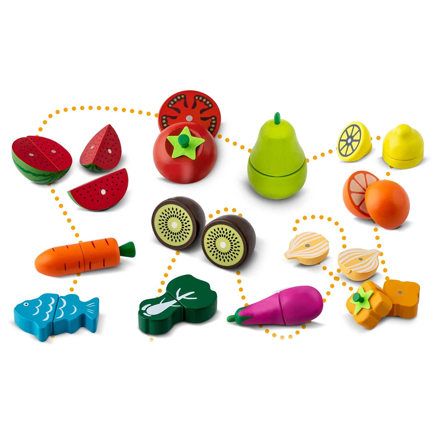 Setul include legume de calitate superioara, fructe si ustensile de bucatarie - precum cutite, tabla de taiere - care pot fi depozitate intr-o cutie eleganta dupa utilizare. Folosirea magnetilor da impresia de autenticitate deoarece legumele pot fi taiate!
