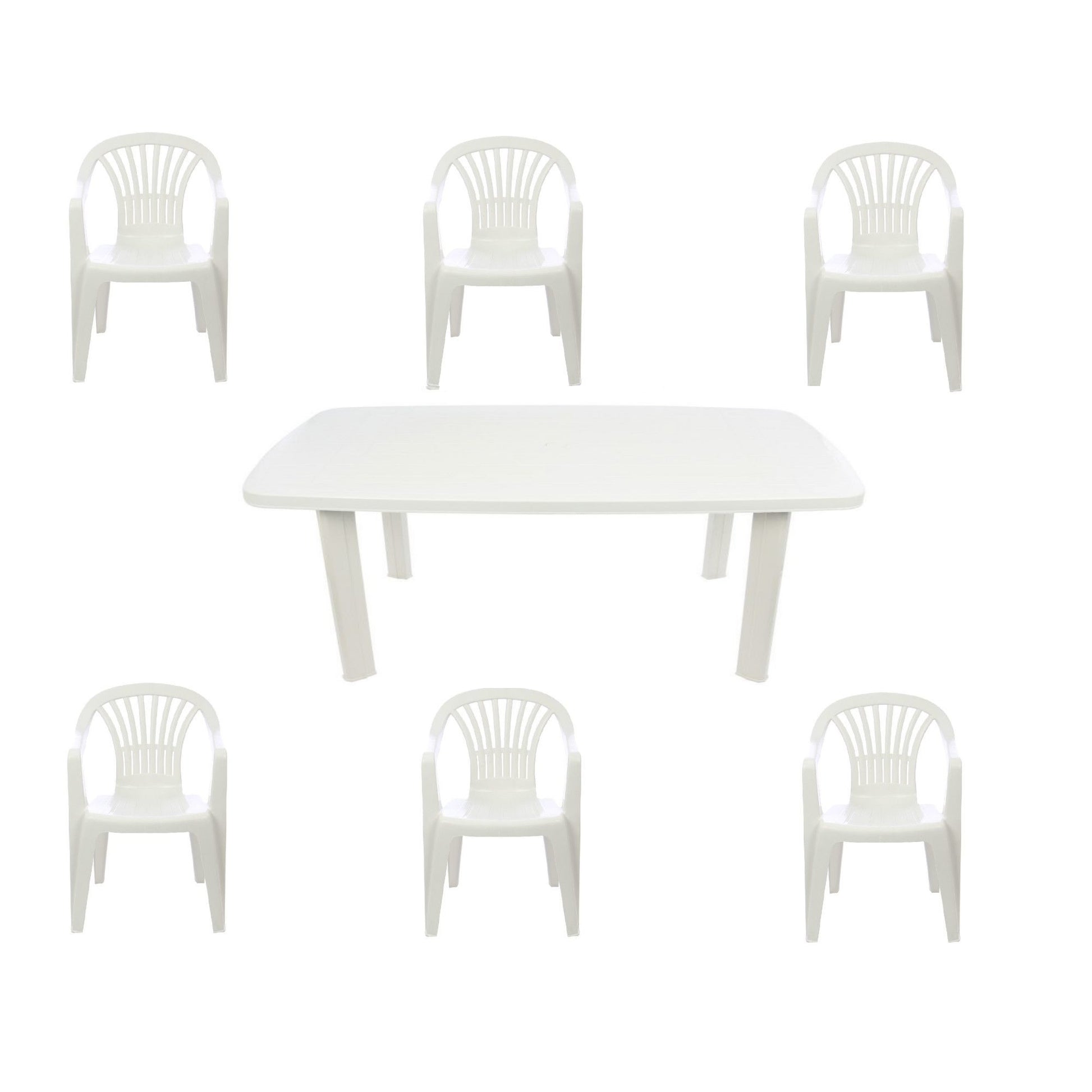 Set masa pentru Gradina IDL® Montero cu 6 SCAUNE, 140x90x72cm, Realizat din plastic de inalta calitate, Rezistent la UMIDITATE, Forma blat DREPTUNGHIULARA ce permite adaptari creative si inovatoare oriunde si oricand, Culoare-Alb