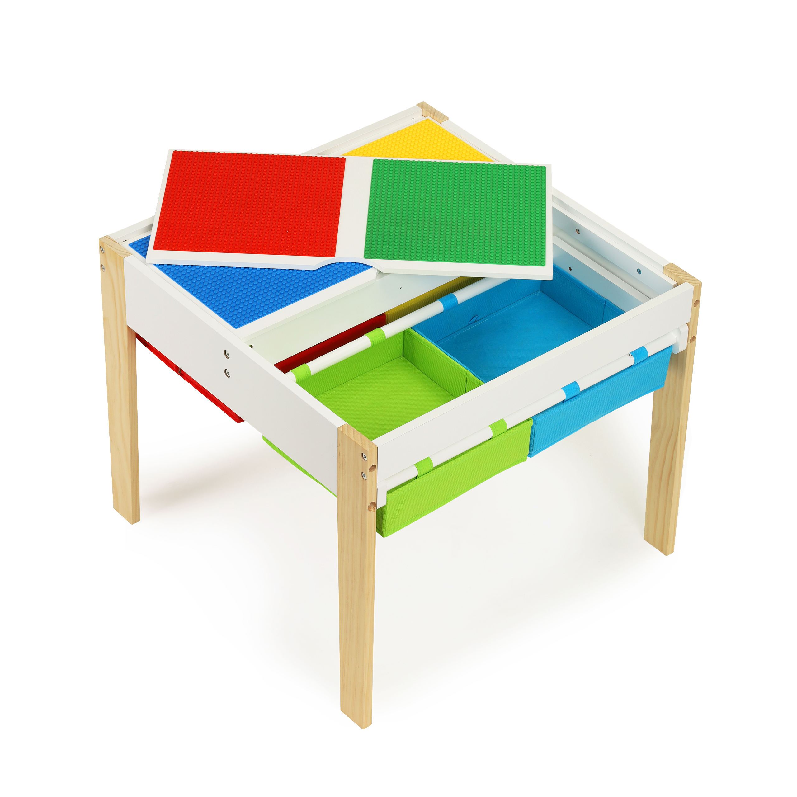 Exista 4 compartimente spatioase care pot gazdui blocuri, jucarii, instrumente de desen si chiar carti.
