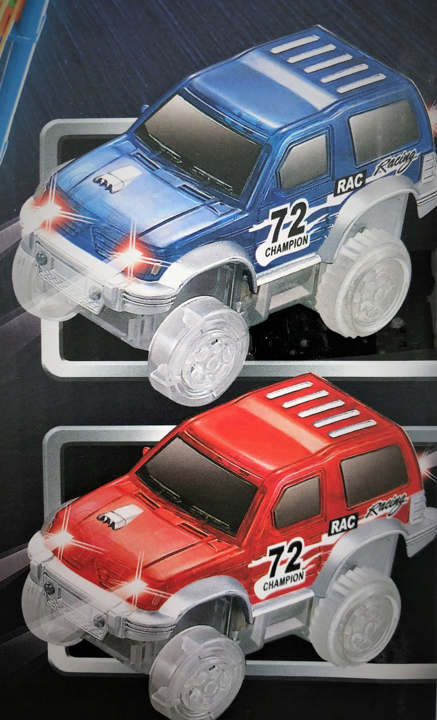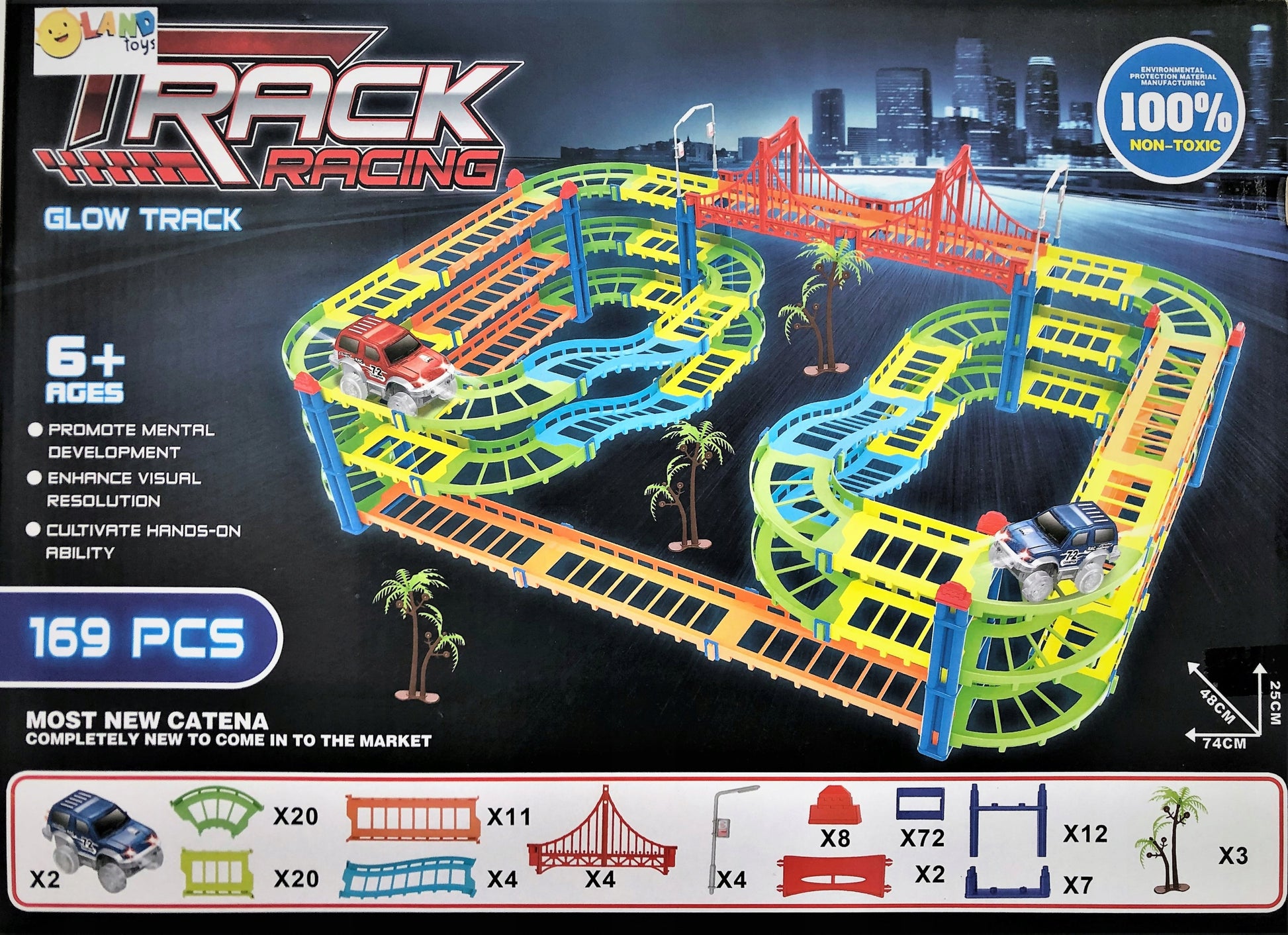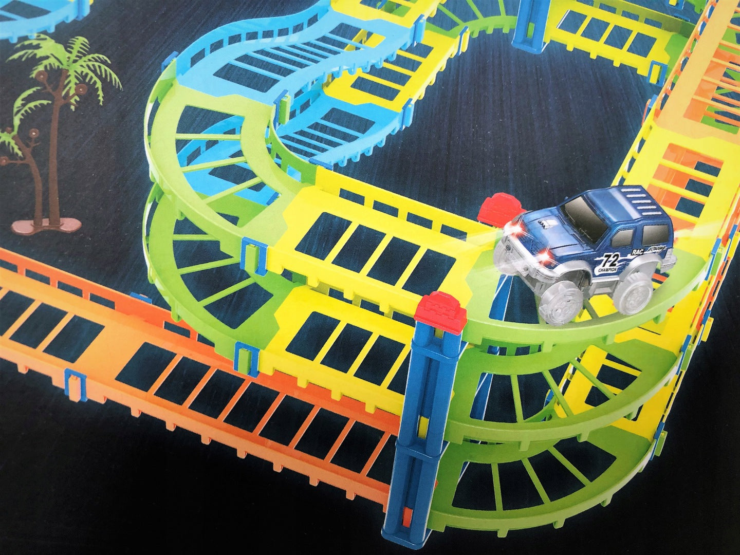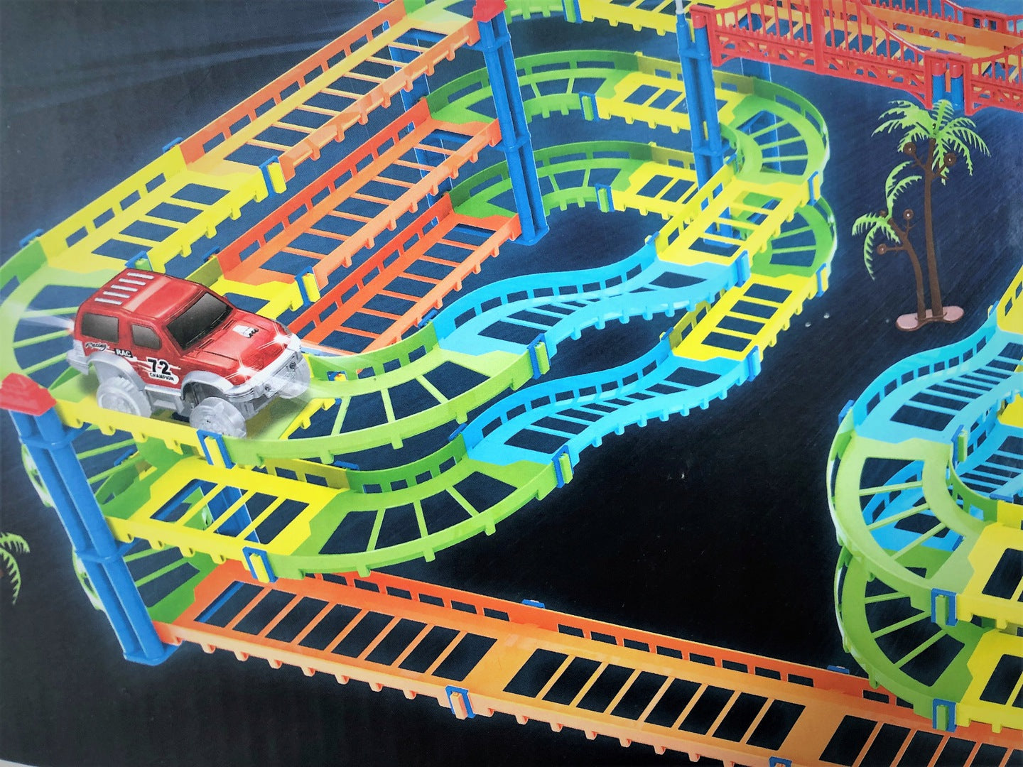 Set pista auto cu doua masinute idealStore CITY GLOW, Contine un total de 169 de piese colorate incluzand doua masinute iluminate LED, Setul flexibil permite dezvoltarea imaginatie si ablitatile practice