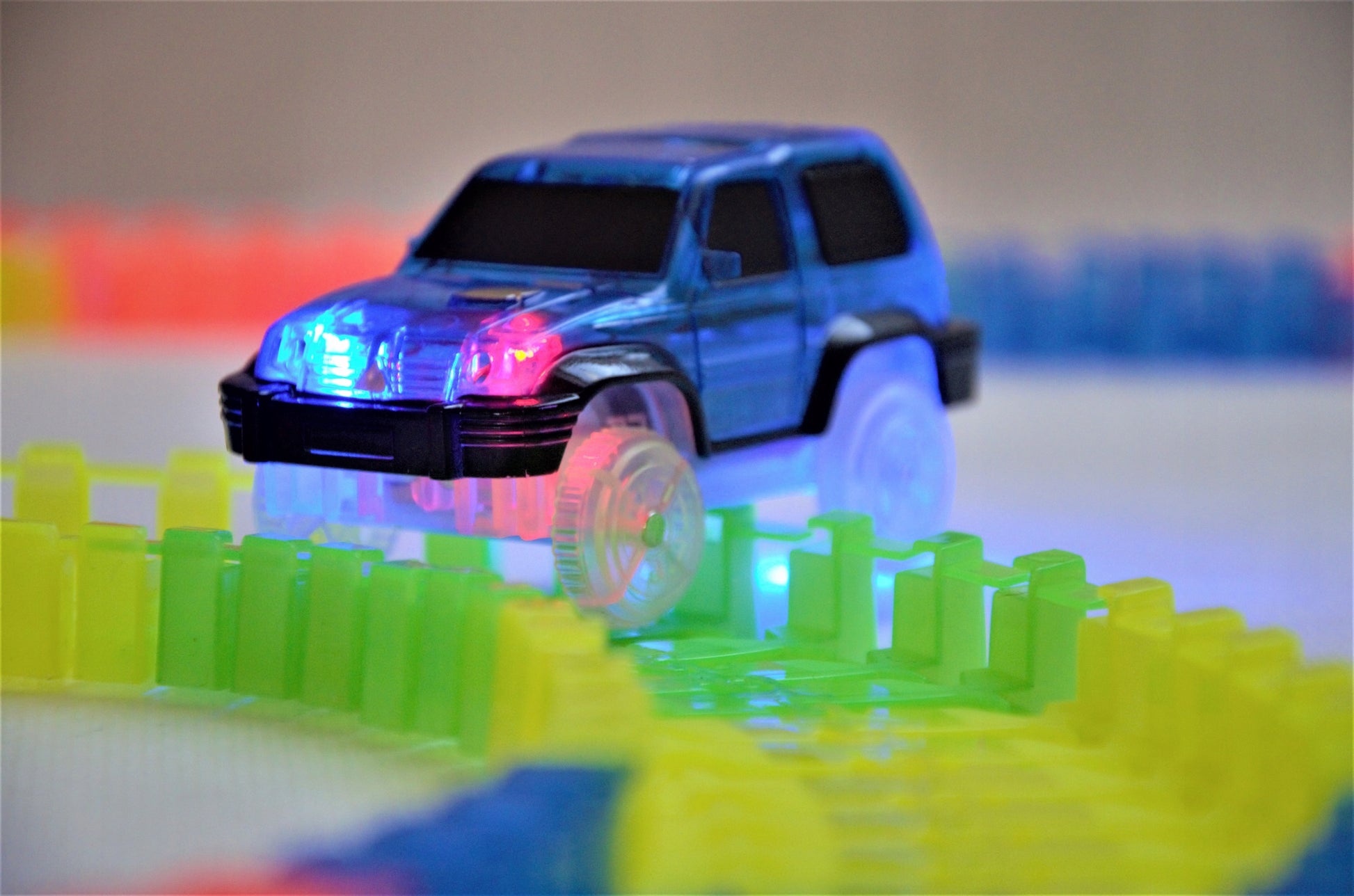 Set pista magica idealSTORE Fluorescent Track, Pista flexibila formata din 220 de elemente fluorescente, Include 3 masinute echipate cu luminite LED, Excelenta pentru orice varsta