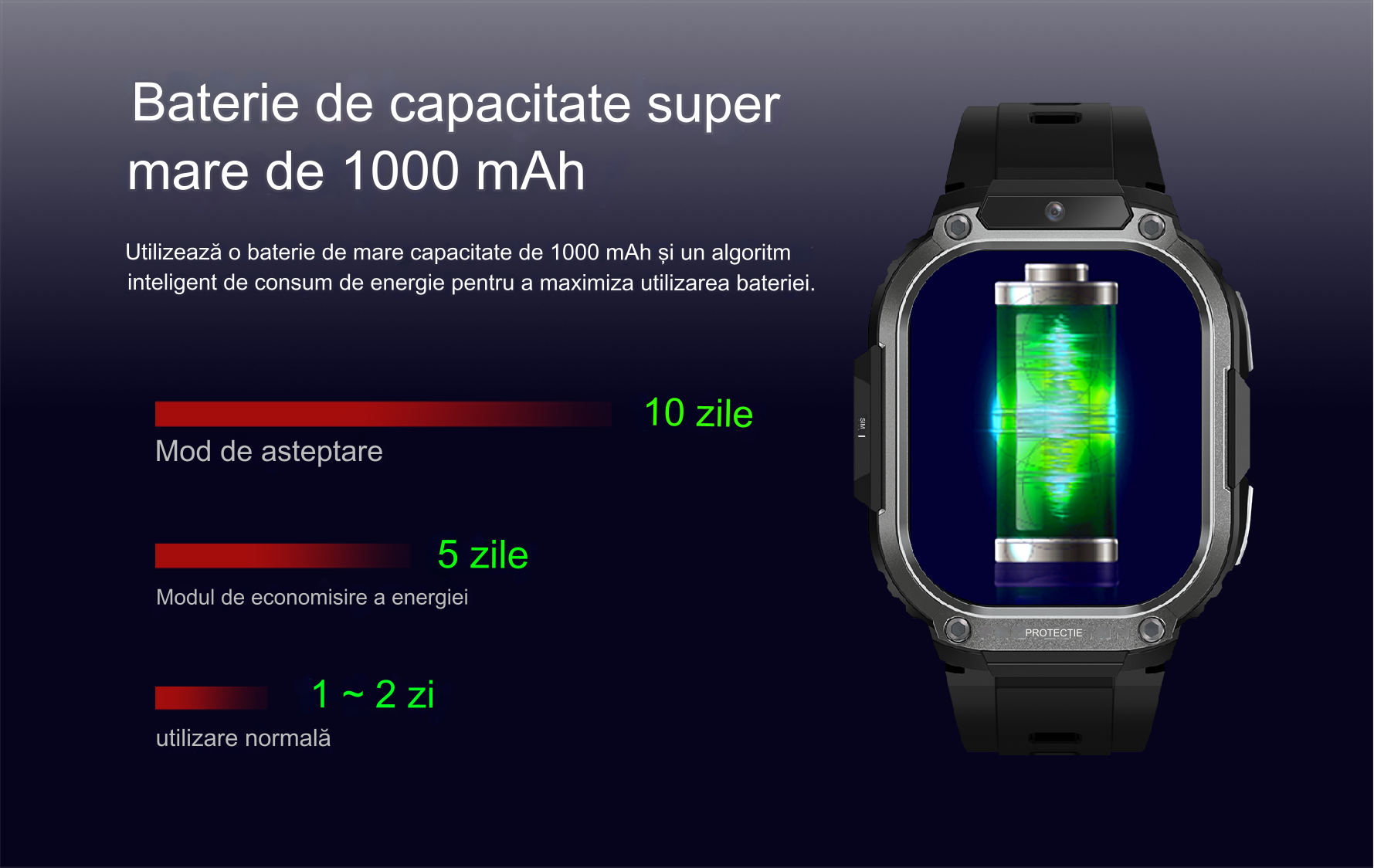 Bateria de 1000 mAh asigura o autonomie in modul de asteptare de 10 zile, iar la o utilizare normala 1 - 2 zile.