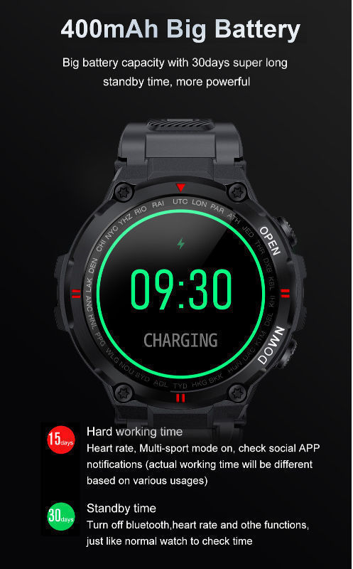 Ceasul inteligent are o baterie incapatoare de 400 mAh care va permite sa utilizati ceasul pana la 5 zile sau pana la 30 de zile timp de asteptare.