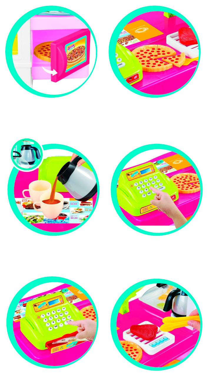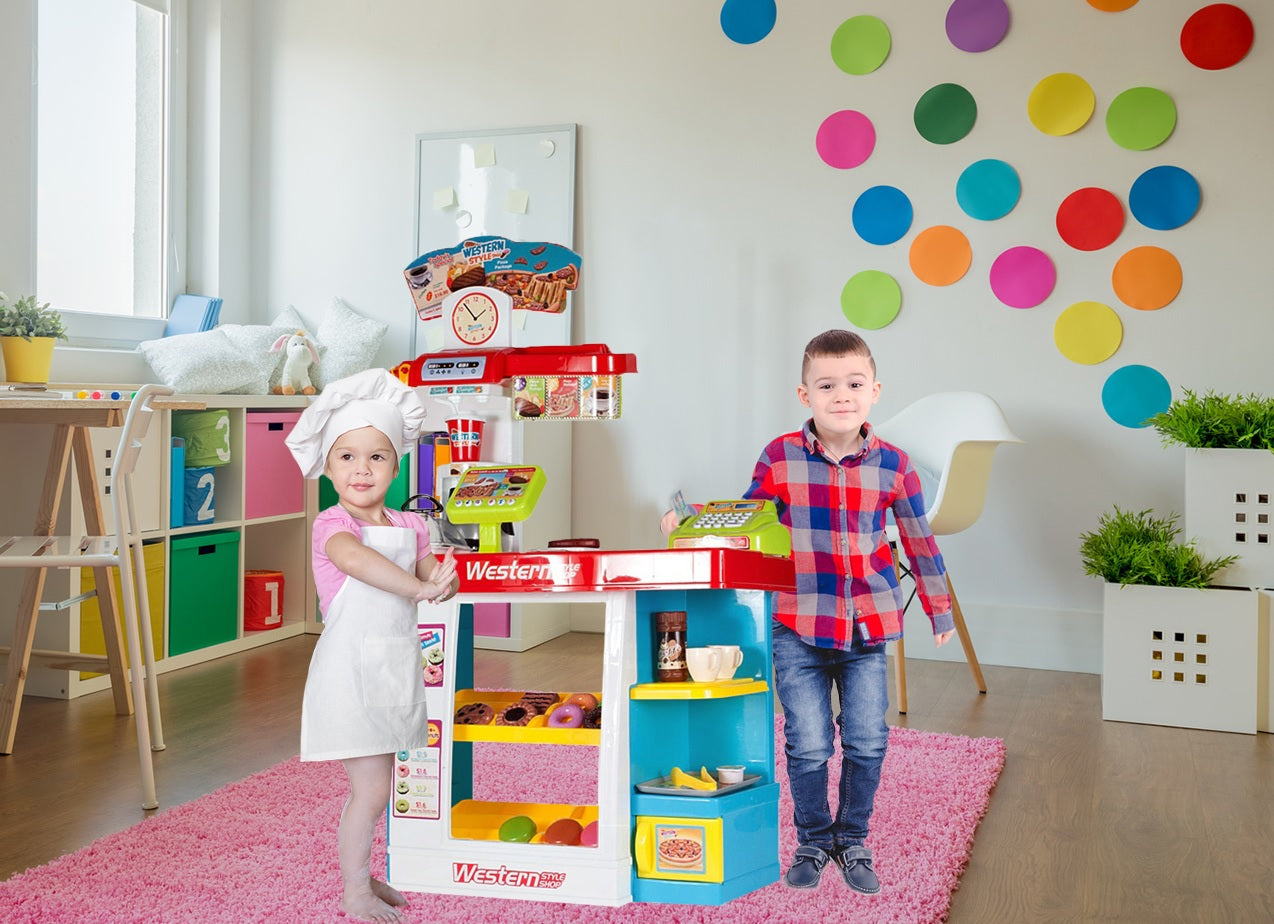 Set mare de joaca imitand fast-food / magazin de unde copilul ar putea servi diverse produse .