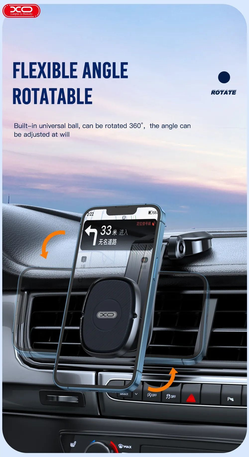 Suportul auto este un accesoriu util pentru orice sofer in timpul calatoriilor. Se ataseaza la grila de ventilatie, fiind special conceput sa nu blocheze ventilatia. Datorita fortei gravitationale, bratele se ajusteaza automat la forma telefonului si ofera o prindere stabila si sigura. Este compatibil cu orice telefon.