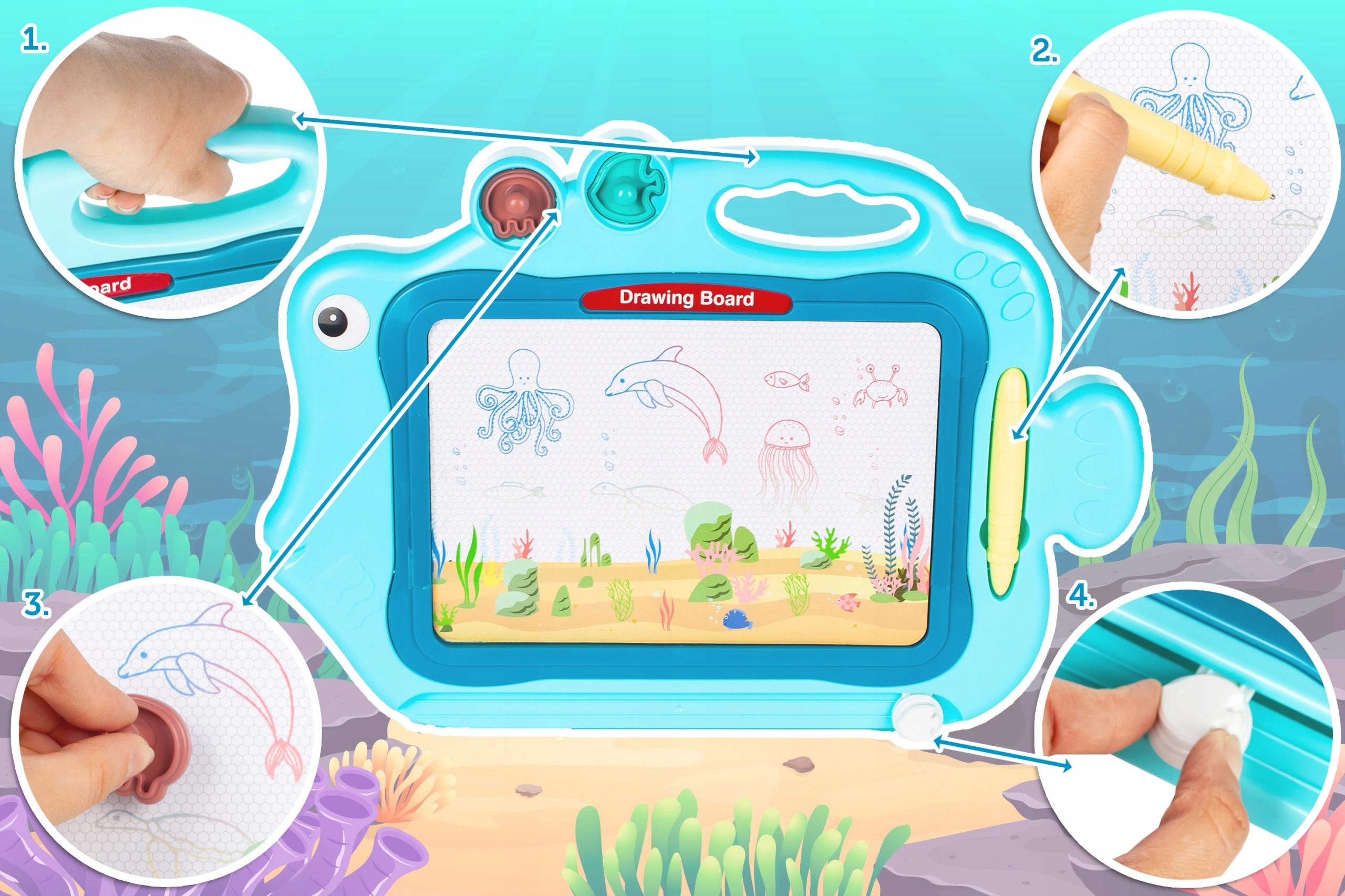 Tablita Magnetica Funny Fish idealStore, 4 Campuri Colorate, 2 Stampile, Pix, Dimensiuni 49.5 x 29.5 x 3.5 cm, Suprafata Desen 24 x 16 cm, Dezvolta Imaginatia si Creativitatea, Incurajeaza Exersarea Scrisului, Albastra