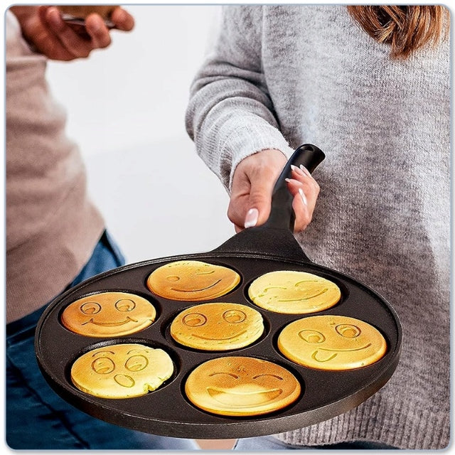 Tigaie antiaderenta pentru mini clatite, mic dejun, Smiley Face- 7 forme, pentru copii, granit, neagra, plite gaz si electrice