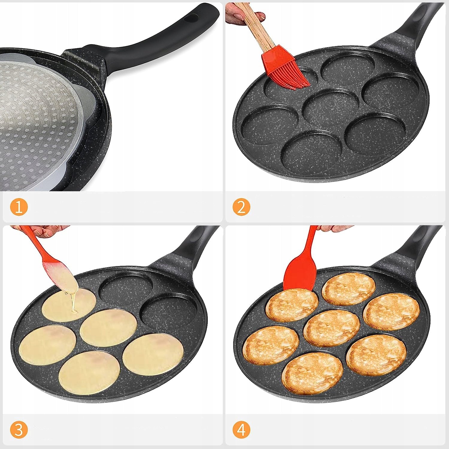 Tigaie pentru clatite, Welora, 7 zone de gatit cu o adancime de 0.7 cm, Confectionata din aluminiu, Antiaderanta, Compatibila cu plite cu inductie, electrice, ceramice si pe gaz, Dimensiuni 47 x 0.7 x 0.8 cm, Negru