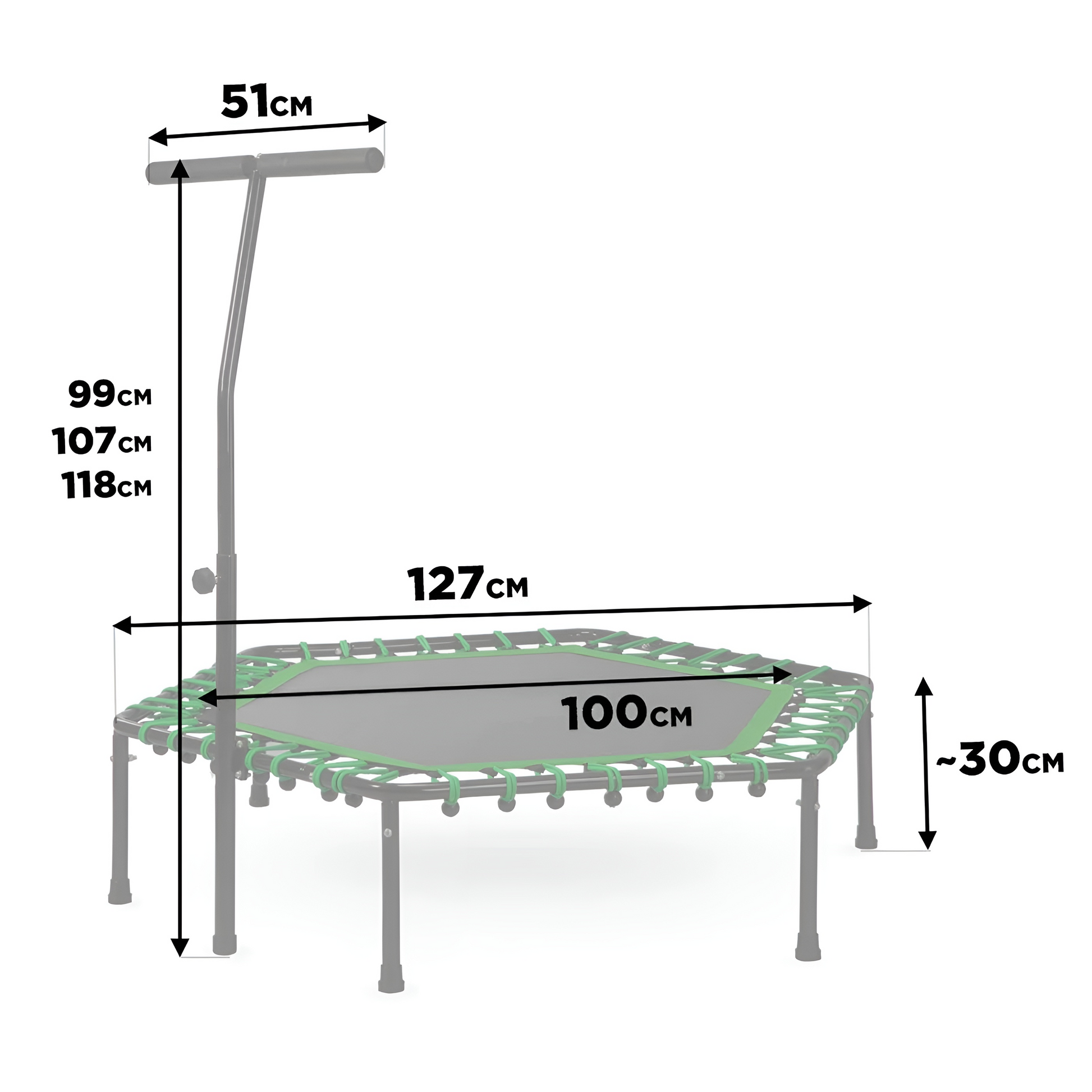 Trambulina fitness CardioTramp IdealStore, Perfect Pentru Antrenamente Acasa, Maner Reglabil, Forma Hexagonala, 6 picioare, Diametru 127 cm, Sarcina 100 kg, Fabricata din Otel, Verde