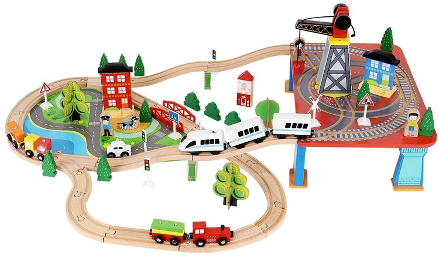 Tren Electric din Lemn Woody Train idealStore, 88 Elemente Frumos Finisate, Pista, Tren de Marfa, Tren de Pasageri, Masinuta, Copaci, Indicatoare Rutiere, Caine Politist, Figurine Persoane, Macara, Elemente Conectate prin Magneti, Dezvolta Imaginatia si Creativitatea
