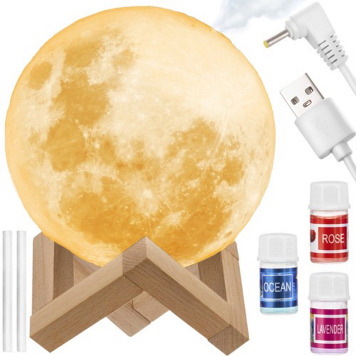 Umidificator de aer 3 in 1 portabil Moon Light IdealStore, Ultra Silentios Contine difuzor de aroma, Lampa LED Touch Control cu 3 moduri de iluminare, Alimentare USB, 3 arome incluse, Capacitate 880 ml, Timp 24h cu un sigur rezervor