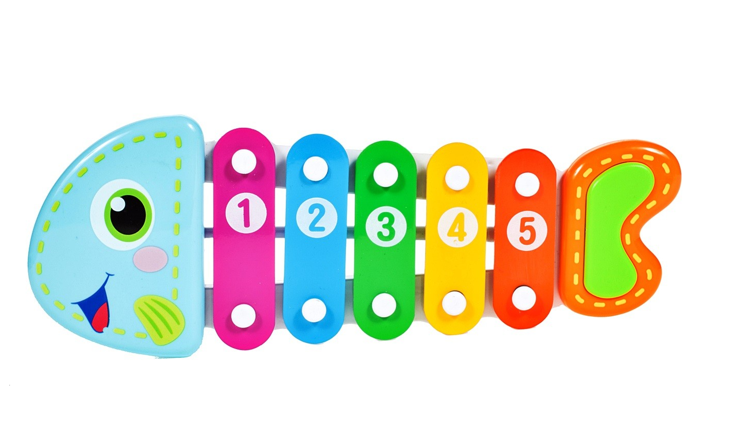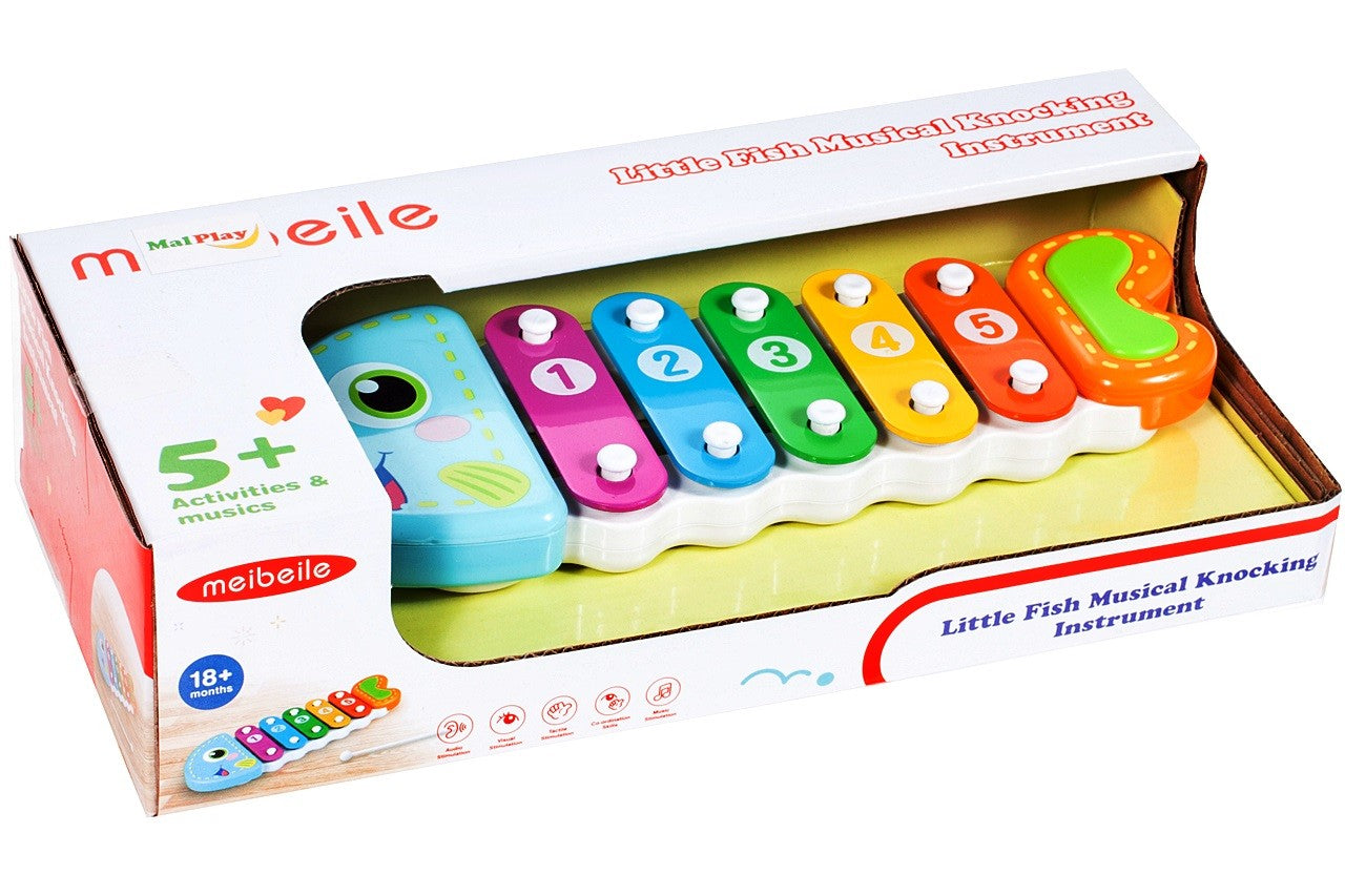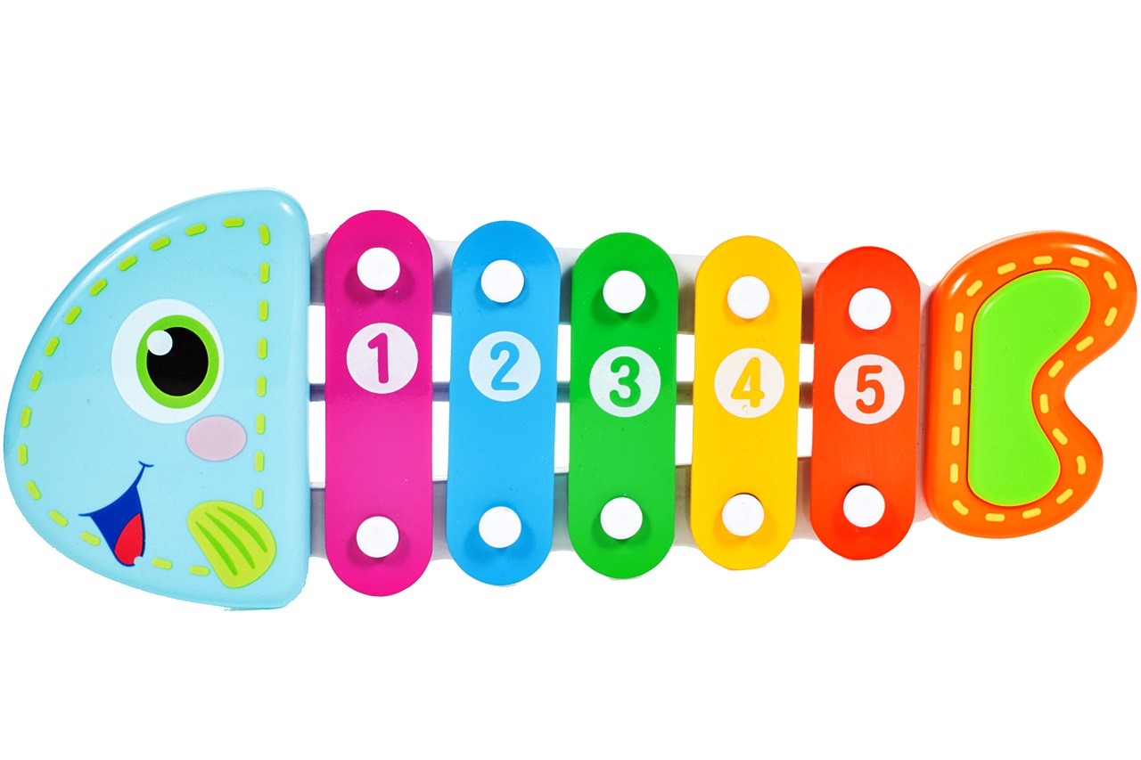 Xilofon Muzical Piranha Fish, 24 cm lungime, Permite dezvoltarea abilitatilor muzicale ce creaza o aventura a sunetelor, Instrument muzical in forma de pestisor ce stimuleaza coordonarea motorie si auditiva implicand multe simturi, Culoare-Multicolor