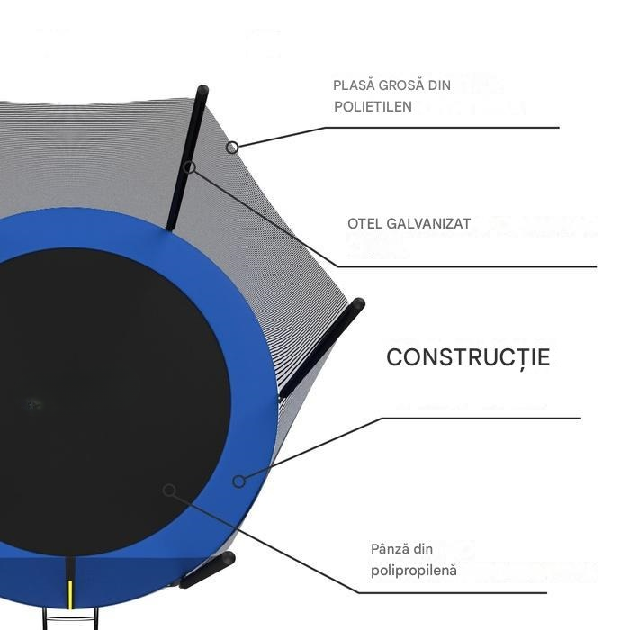 Datorita materialelor sale durabile, a captuselii din spuma a stalpilor si a covorului de protectie, trambulina este rezistenta la intemperii si la razele UV. Nu trebuie sa va faceti griji cu privire la uzura accelerata sau la deteriorarea unitatii atunci cand este expusa la conditii meteorologice nefavorabile.